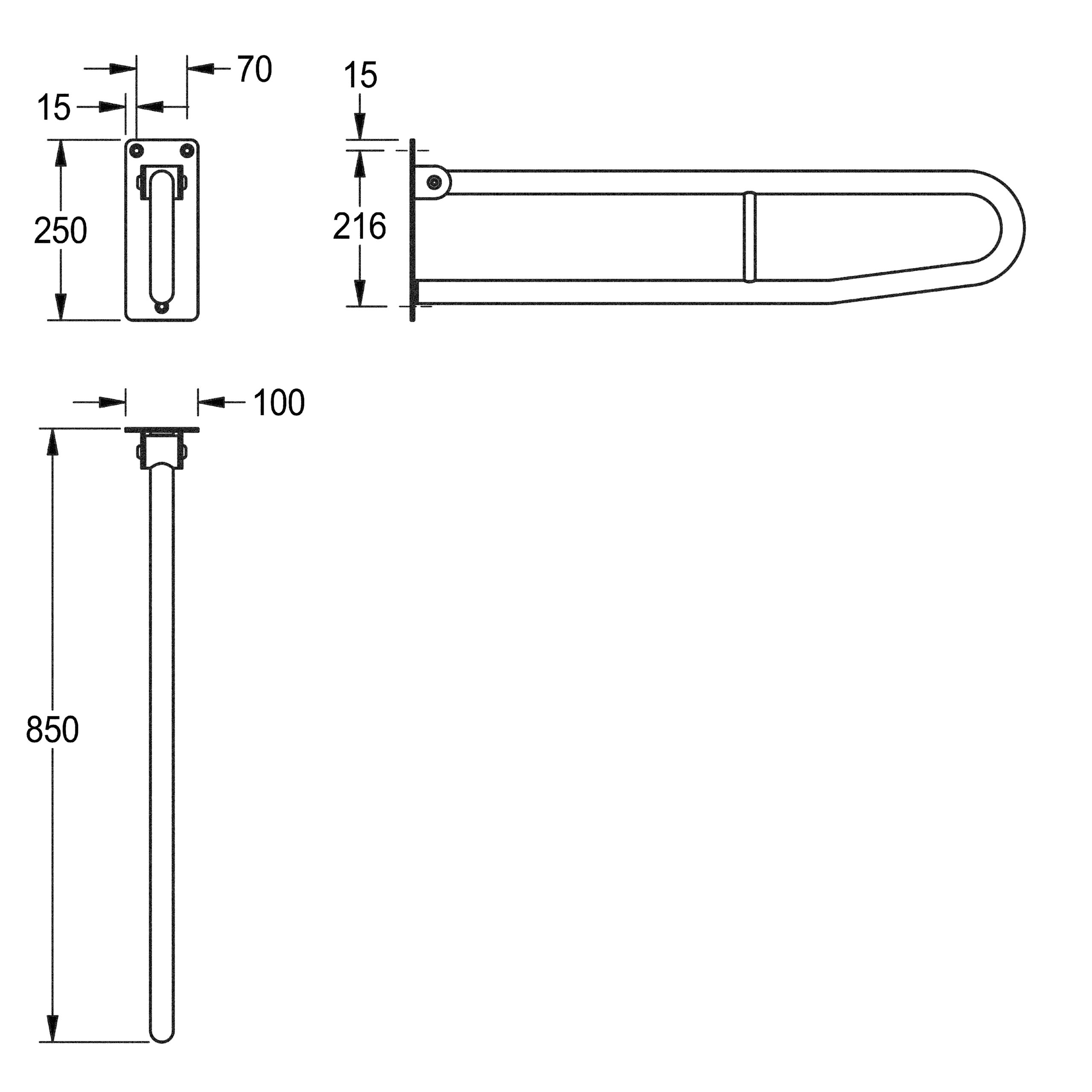 Foldable grab rail without toilet roll holder for wall mounting, stainless steel, surface satin finished, rough polishing for better surface feel, 32mm pipe diameter, material thickness 1.2mm, prevention against unmeant folding, gum rubber stop absorber, inspected and certified product, 4mm thick mounting plate with three fixing holes, including stainless steel screws and dowels.