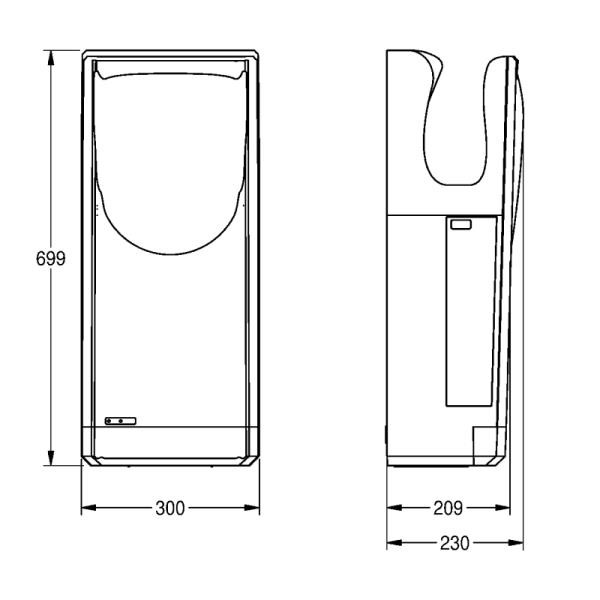 High Speed “Hands-in” hand dryer for wall mounting, antibacterial ABS plastic, colour silver, drying time 7-10 seconds, hygienic thanks to non-contact opto-electronically controlled release and integrated HEPA filter, adjustable air speed, optionally warm or cold air, auto shutdown after 25 seconds, water tank and discharge can be cleaned separately, protection class IPX4. Cable and plug not included in scope of delivery.
