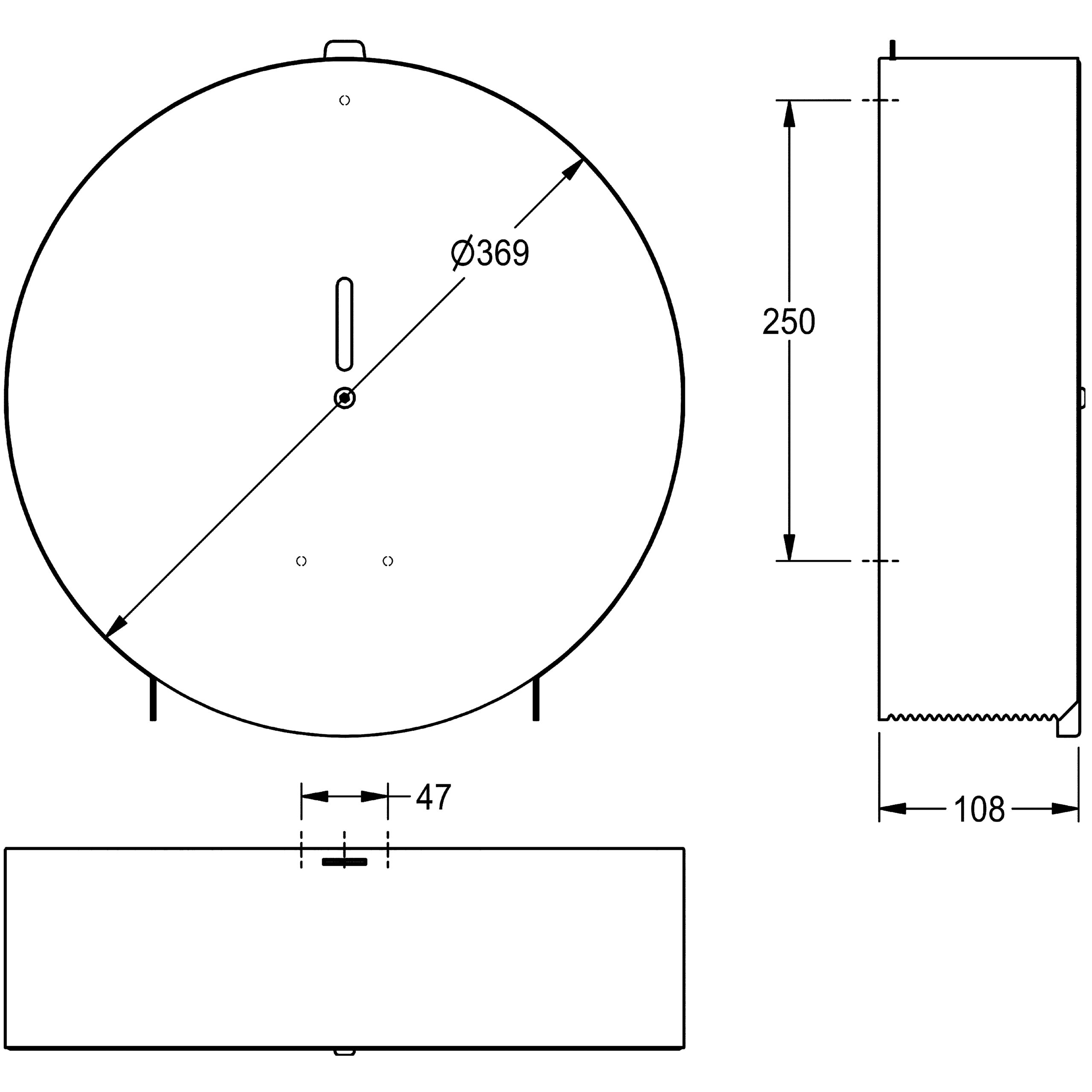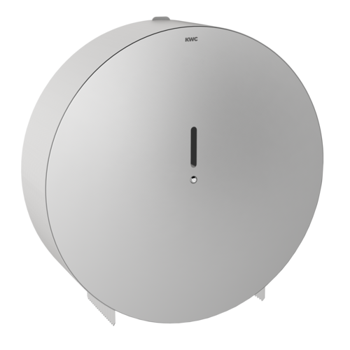 Jumbo roll holder for wall mounting, stainless steel, surface satin finished, material thickness 0.9 mm, closed round casing with inspection window, paper withdrawal over two tear-off edges, locked with hexagonal allen screw, for 1 roll with max. Ø 350 mm, incl. stainless steel screws, dowels and hexagonal allen key.
