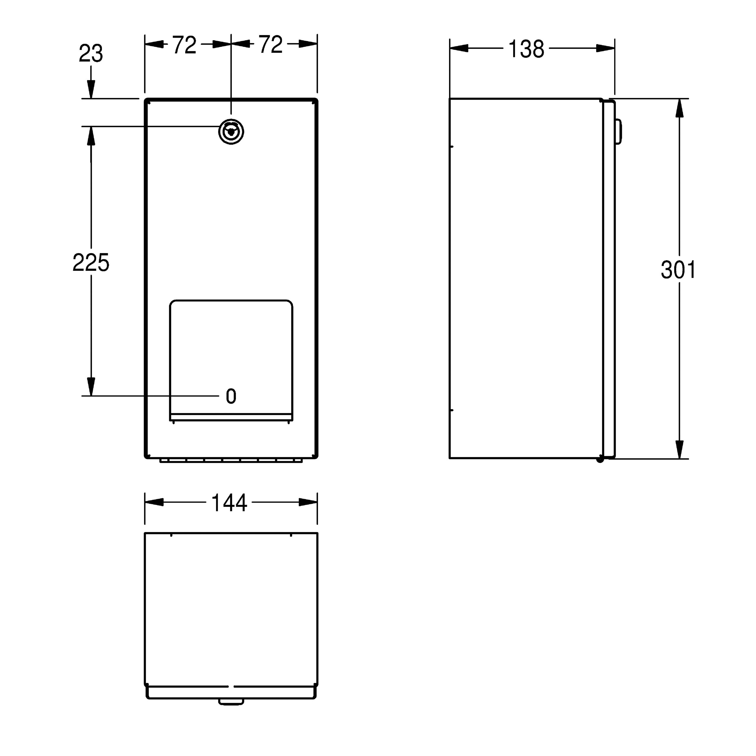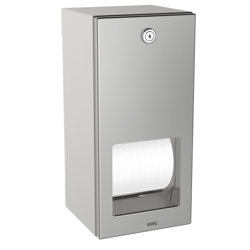 Double toilet roll holder with spindle system for wall mounting, stainless steel, surface satin finished, material thickness 0.8 mm, folded front cover, cylinder lock with KWC standard key, for 2 rolls with max. Ø120mm, second roll will be released after consumption of first roll, with spindles, reserve roll not visible, incl. stainless steel screws and dowels.