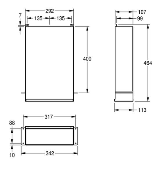 Paper towel dispenser for hidden mounting behind wall and mirror, stainless steel, surface satin finished, material thickness 0.8 mm, for 600 – 800 paper towels, depending on convolution, filling from bottom, incl. stainless steel screws and dowels. 342x464x113 mm (WxHxD)