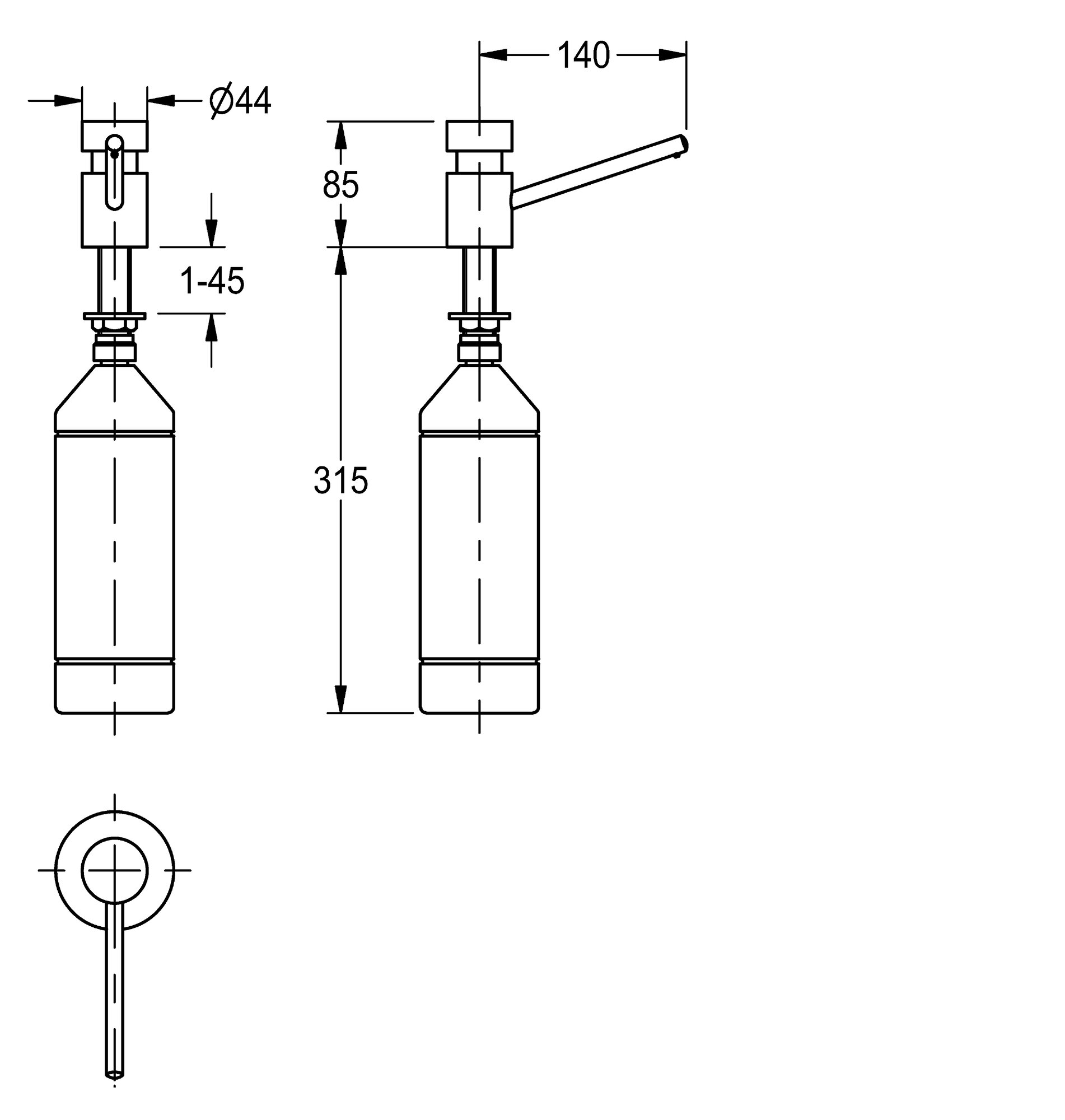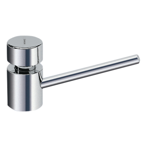 Soap dispenser for table top mounting into worktops with max. 45mm thickness, high polished chromated brass, requires 22 mmdrilling hole, 1/2” thread, spout not movable, spout length 140 mm,suitable for liquid soaps and lotions, 1 liter soap tank withmembrane for pressure balance, filled from above.