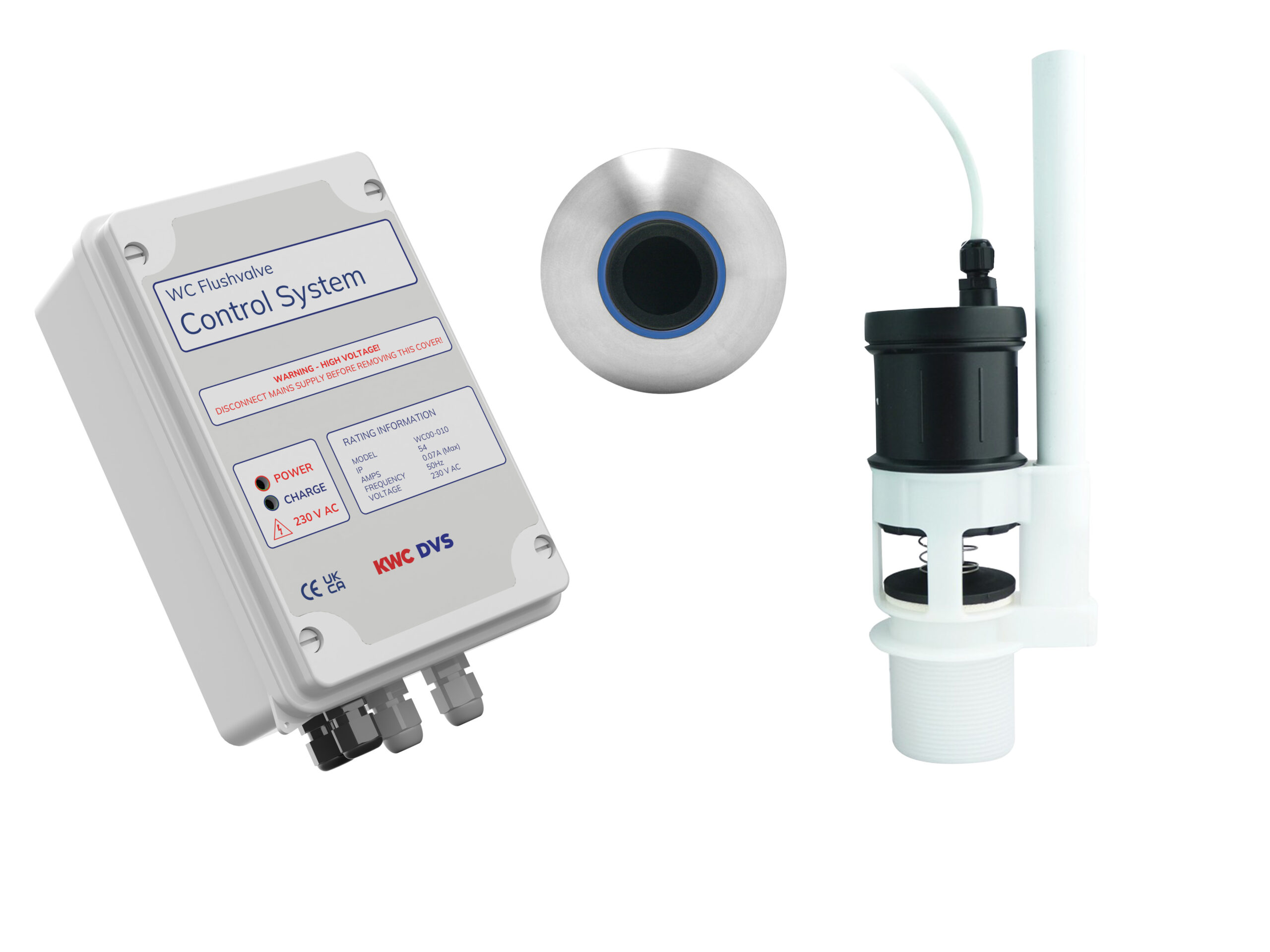 The KWC DVS no-touch WC flushing system is an electronically operated drop valve which replaces the traditional syphon and delivers a WRAS Approved 4L single flush from the cistern to the lavatory bowl.